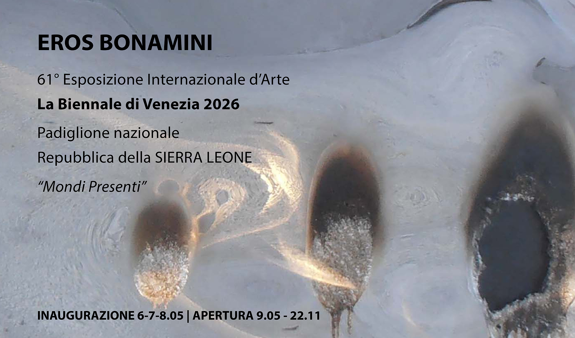 Padiglione nazionale della Repubblica della Sierra Leone Artisti presentati: Eros Bonamini Inaugurazione 09/05/2026Chiusura 22/11/2026 Sede: Liceo Artistico Statale M. Guggenheim – Sestiere Dorsoduro, 2613 - 30123 Venezia